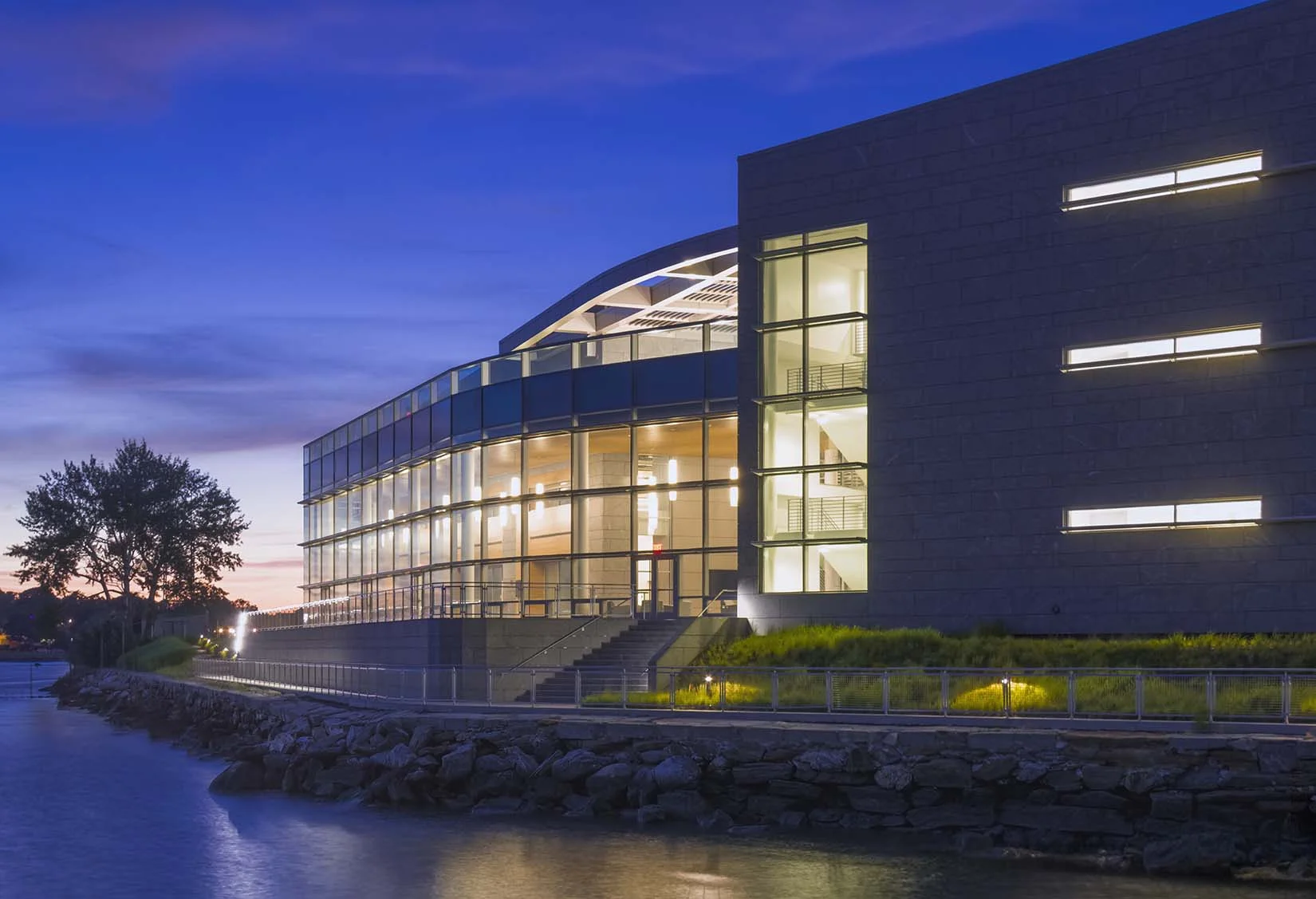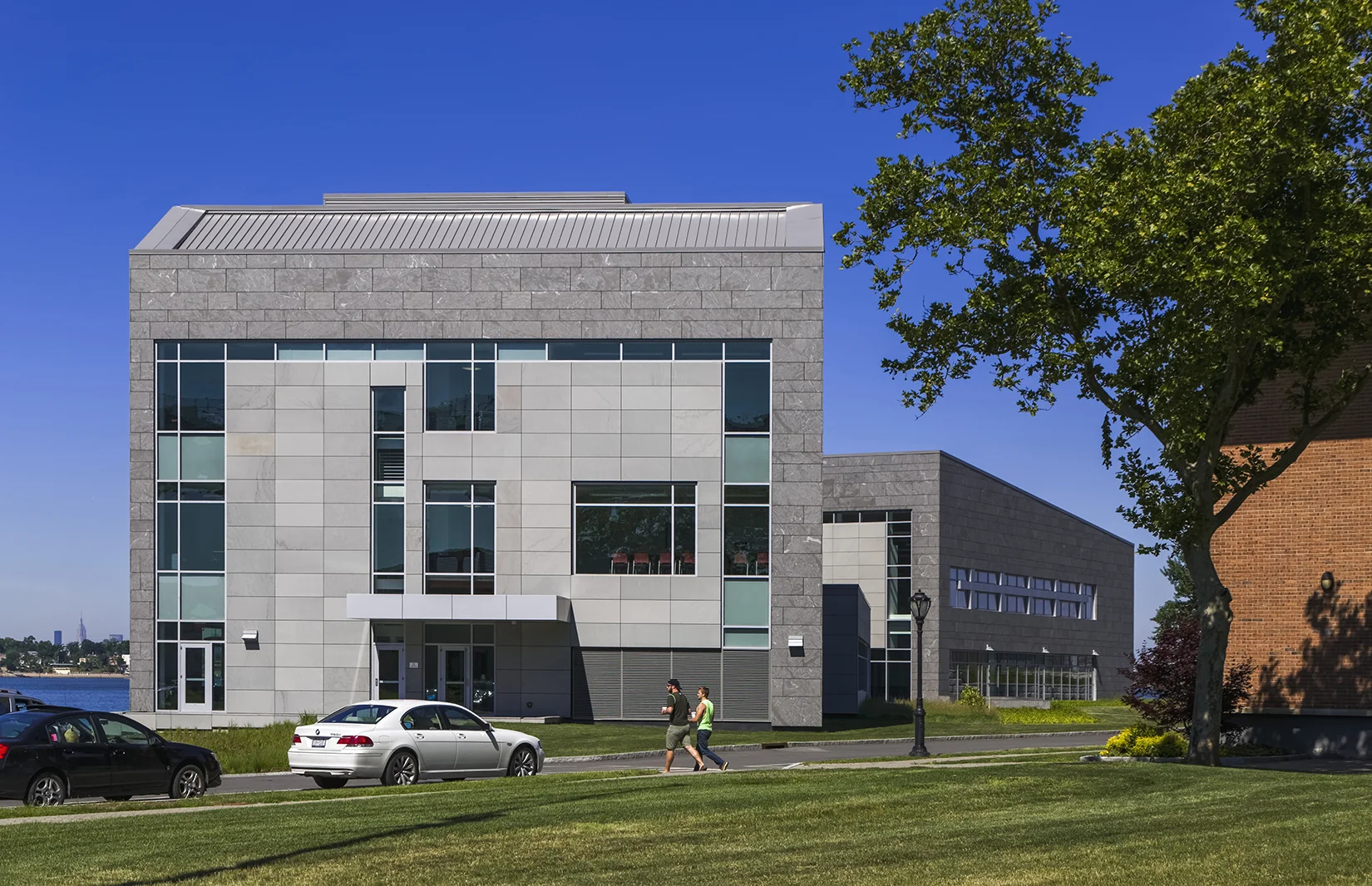 This project is a new 40,000sf classroom building on a tiny but wonderful site adjacent to the Throgs Neck Bridge where the East River becomes the Long Island Sound. We took an aggressive approach to the sustainable design of the building, and clad it in stone matching the historic fort on campus.