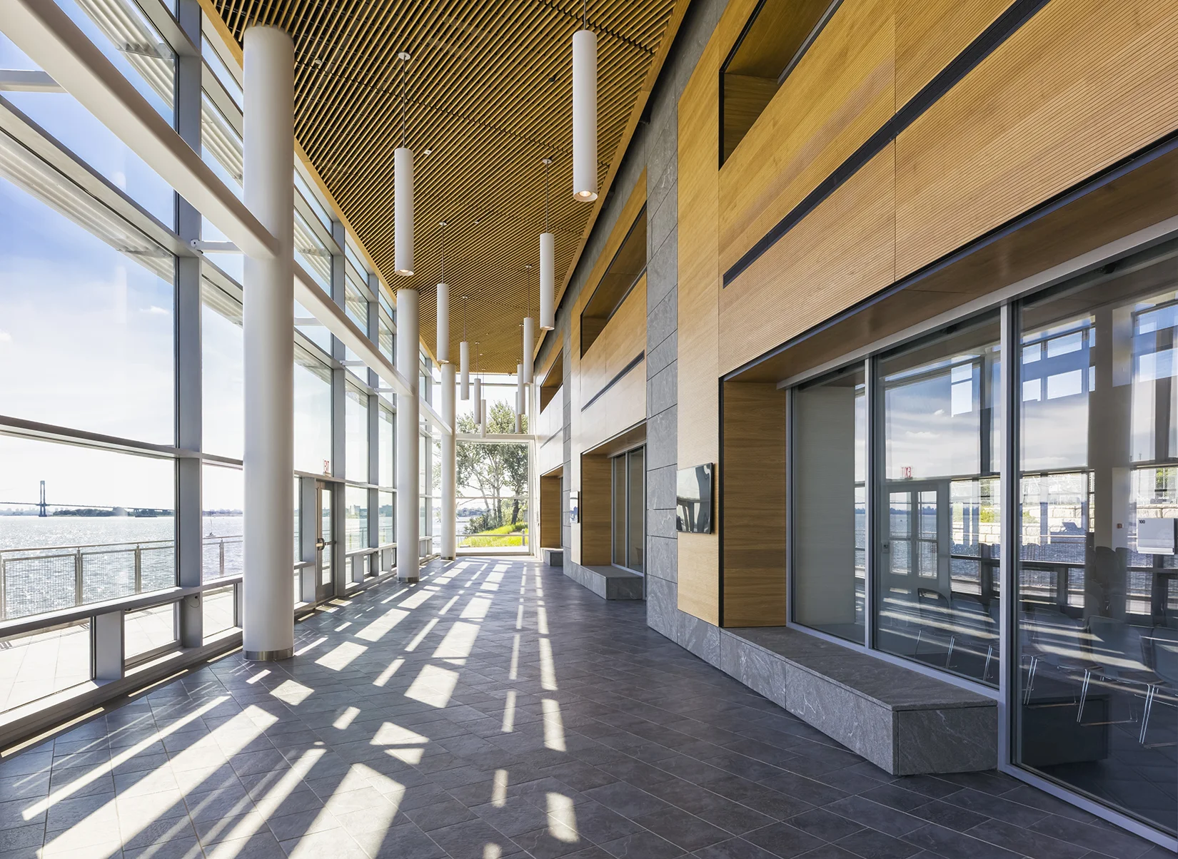 The very strong prevailing winds on the site were simultaneously studied to understand how they could be exploited in the summer and avoided in the winter. The building's main lobby takes advantage of summer winds for passive natural ventilation. Conversely, the building is aerodynamic with respect to the winter winds minimizing energy loss due to infiltration.