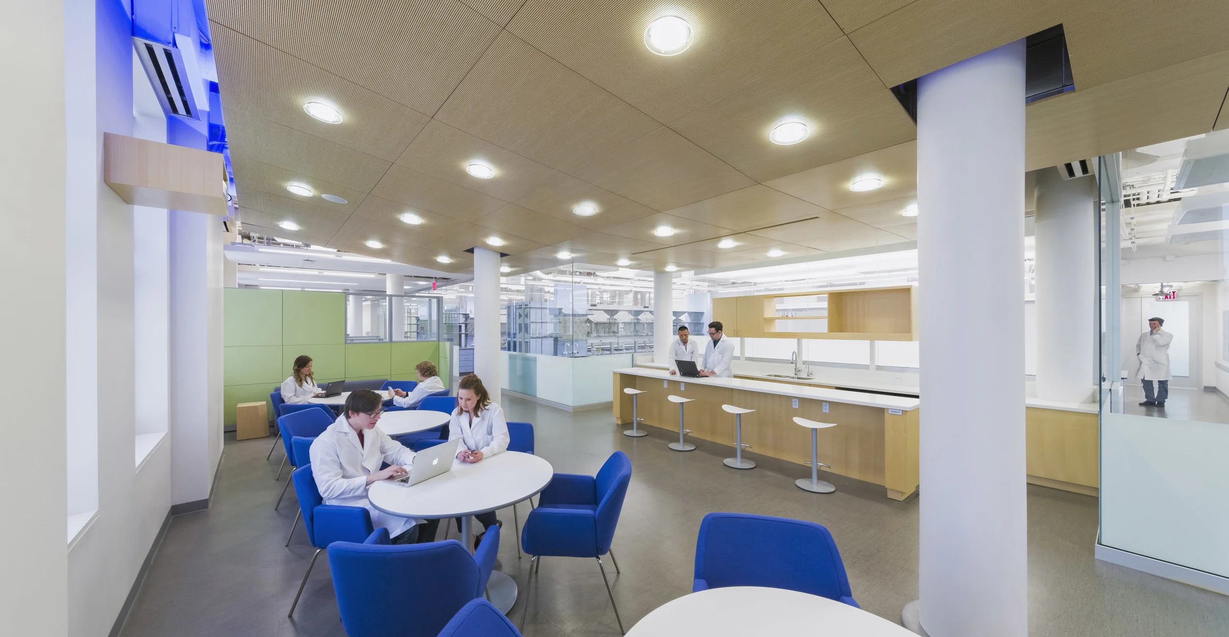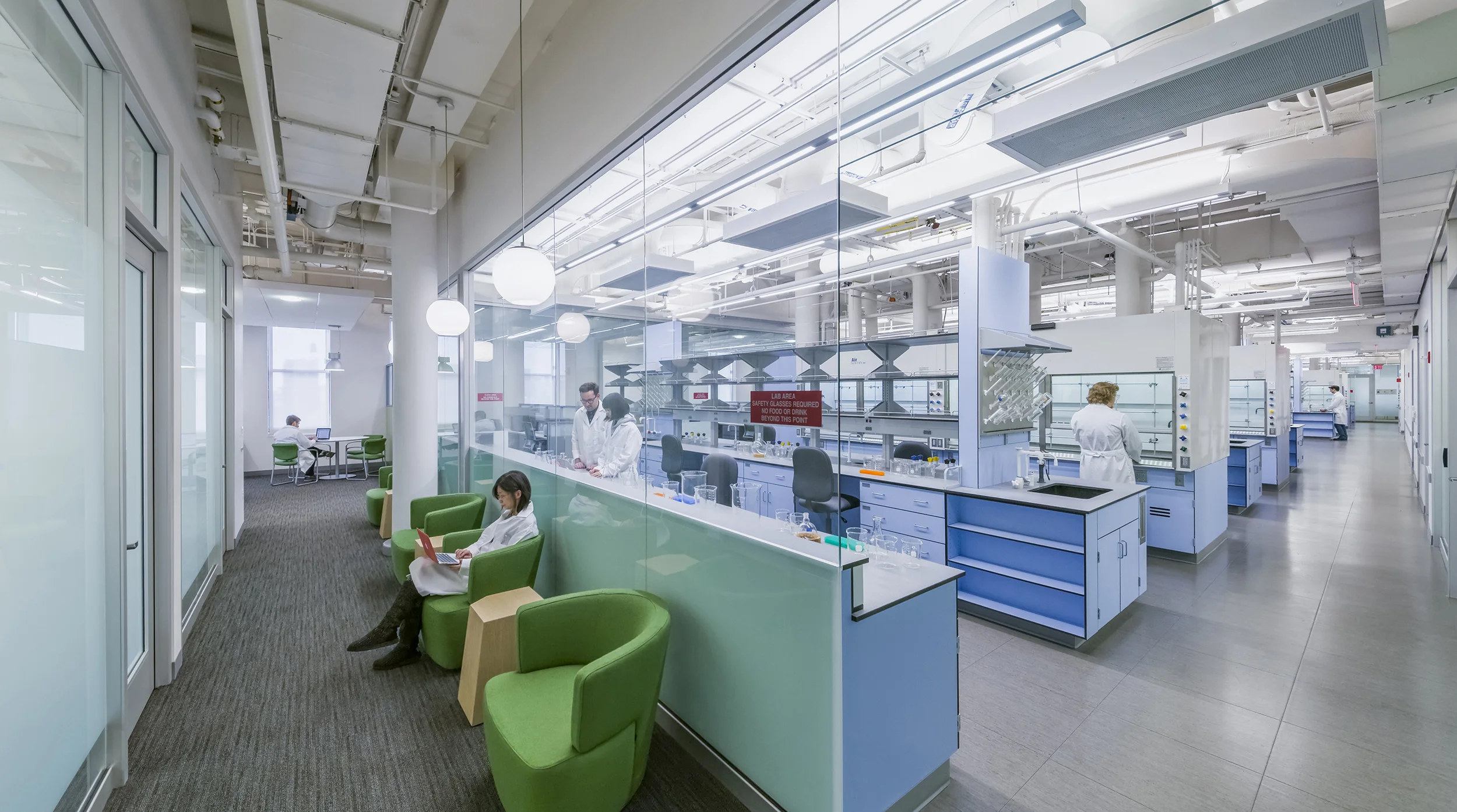 For this 2 floor, 40,000sf gut-renovation we were tasked with creating world-class research labs with adjacent office and social spaces that could act as recruiting tools for new faculty and students, be open and flexible enough to accommodate evolving fields of study, and create the opportunities for the exchange of ideas between colleagues.